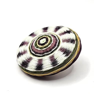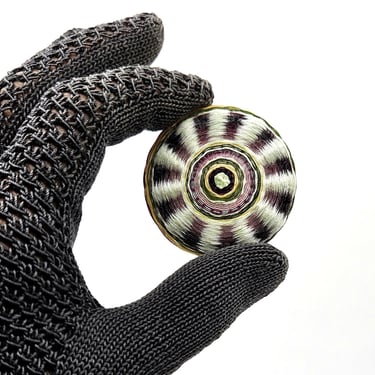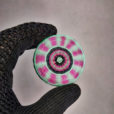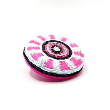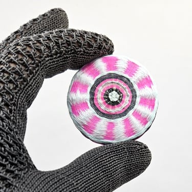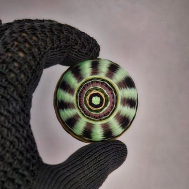 Horsehair, plant fiber, monofilament, photoluminescent thread, laser-engraved acrylic, nickel-silver pin, and steel.