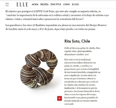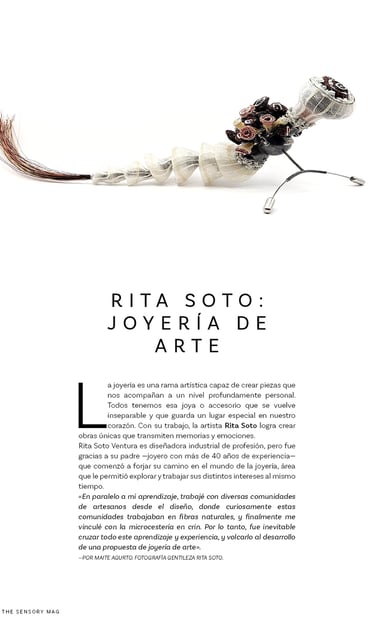 La diseñadora y joyera Rita Soto, reversionó la técnica de microcestería aplicada al crin de caballo al deconstruir el formato habitual de las piezas y realizarlas con figuras volumétricas y tridimensionales. A días de estrenar su última obra en la III Bienal Latinoamericana de Joyería Contemporánea, cuenta cómo y por qué realiza estas originales joyas contemporáneas que la convierten en embajadora de la joyería de Chile.