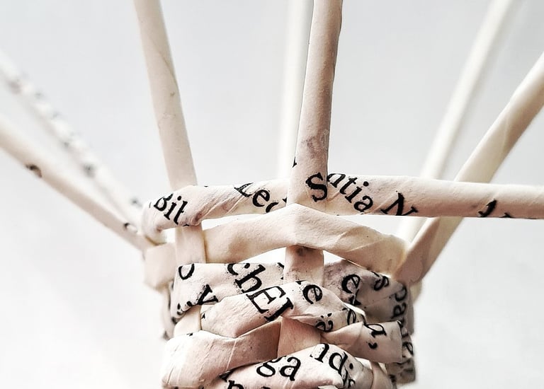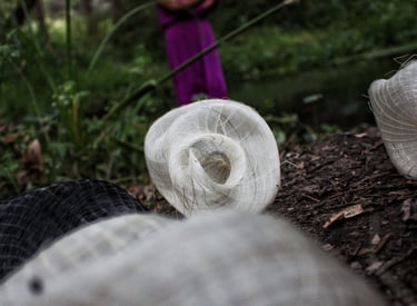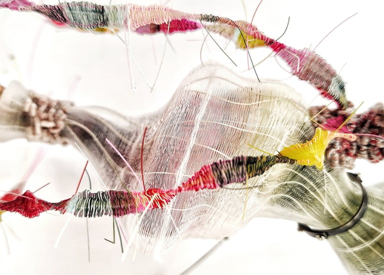 Trabajo con técnicas ancestrales como la micro cestería y materiales cargados de memoria —fibras, metales, crin— para tramar relatos donde lo personal se cruza con lo colectivo.